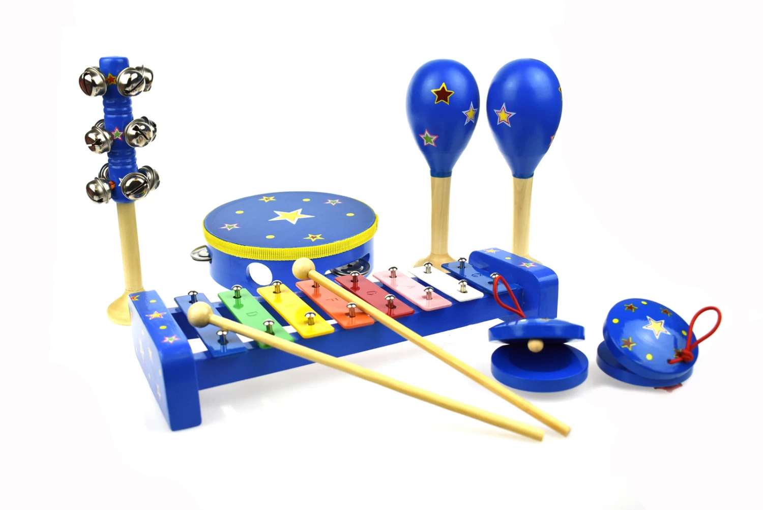 Xylophone size 26.5cm x 11.5cm x 4.5cm Tambourne size  15cm x 15cm x 4.5cm Maraca size 6cm x 6cm x 8cm Bell stick size 5cm x 5cm x 19cm Castanet size 5.5cm x5.5cm x 2.5cm