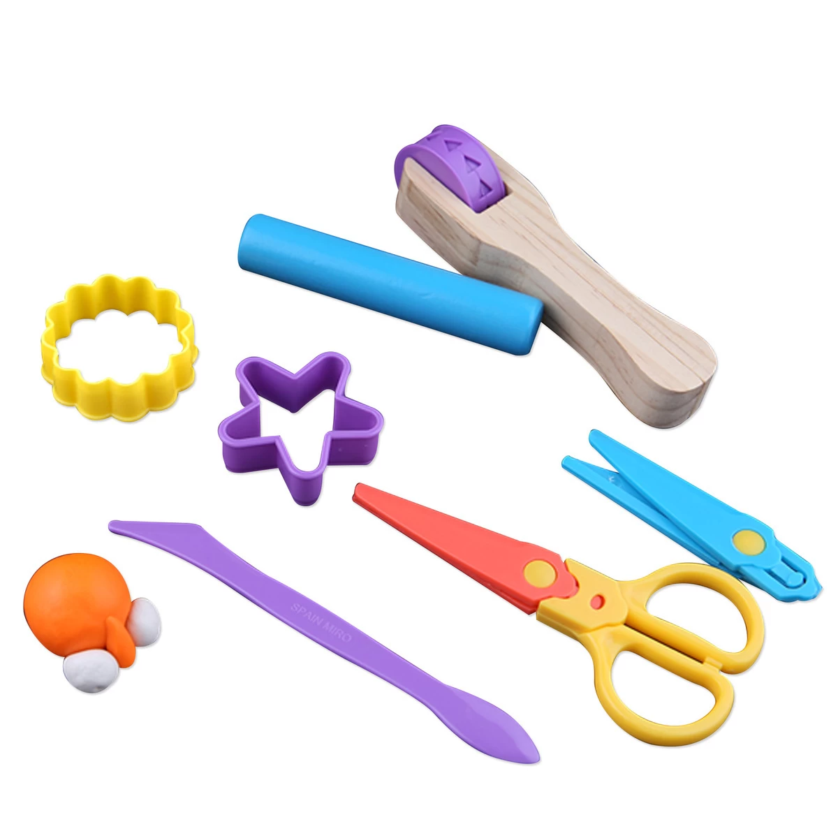 The perfect collection of dough accessories! Includes tools to roll, stamp and cut the modeling dough.
