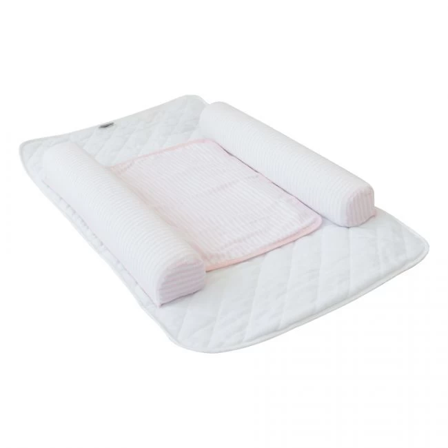 With its soft padded base, the change mat is wonderfully comfortable for you baby’s delicate body. Like a conventional change mat it has high sides to prevent your baby from rolling over but these rolls are adjustable (with high quality velcro) so that they can be moved to fit most change tables or chests on the change pad.
