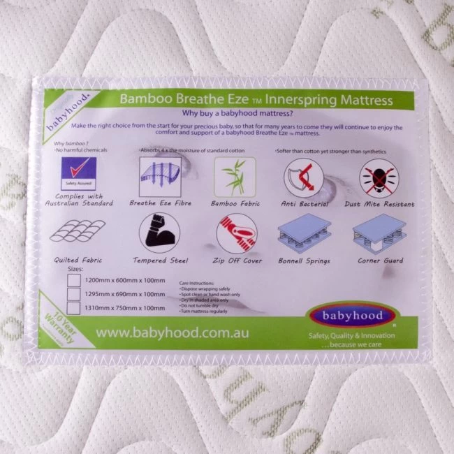 The babyhood Bamboo Breathe Eze Innerspring Mattress is designed to provide your baby with optimum support for their delicate body and the 100% bamboo cover which zips off for a more hygienic sleeping environment; will be perfect for your baby’s delicate and sensitive skin, with its super soft feel, keeping your baby more comfortable and safer, in a firmer innerspring mattress, that will last for years to come.