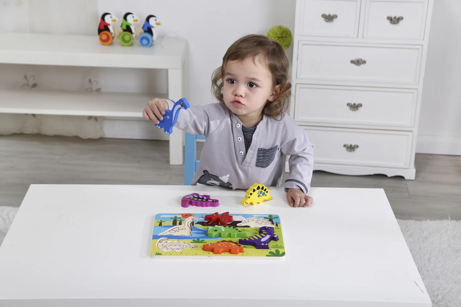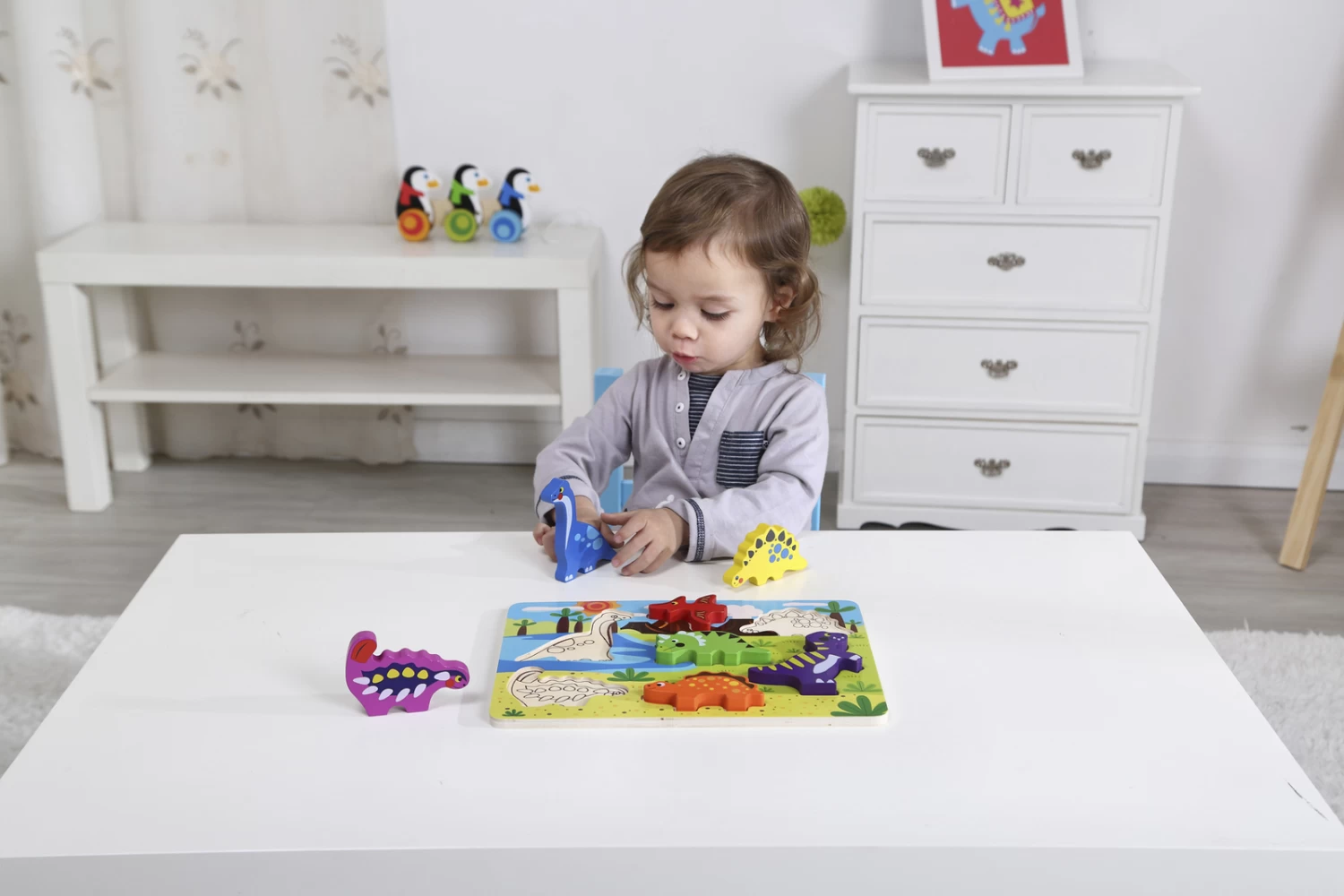 Bright and colourful dinosaurs are featured on this extra thick wooden puzzle. Eight easy-grasp, chunky wild animal pieces . The dinosaur pieces stand upright for pretend play. Encourages eye-hand, fine motor and creative skills.