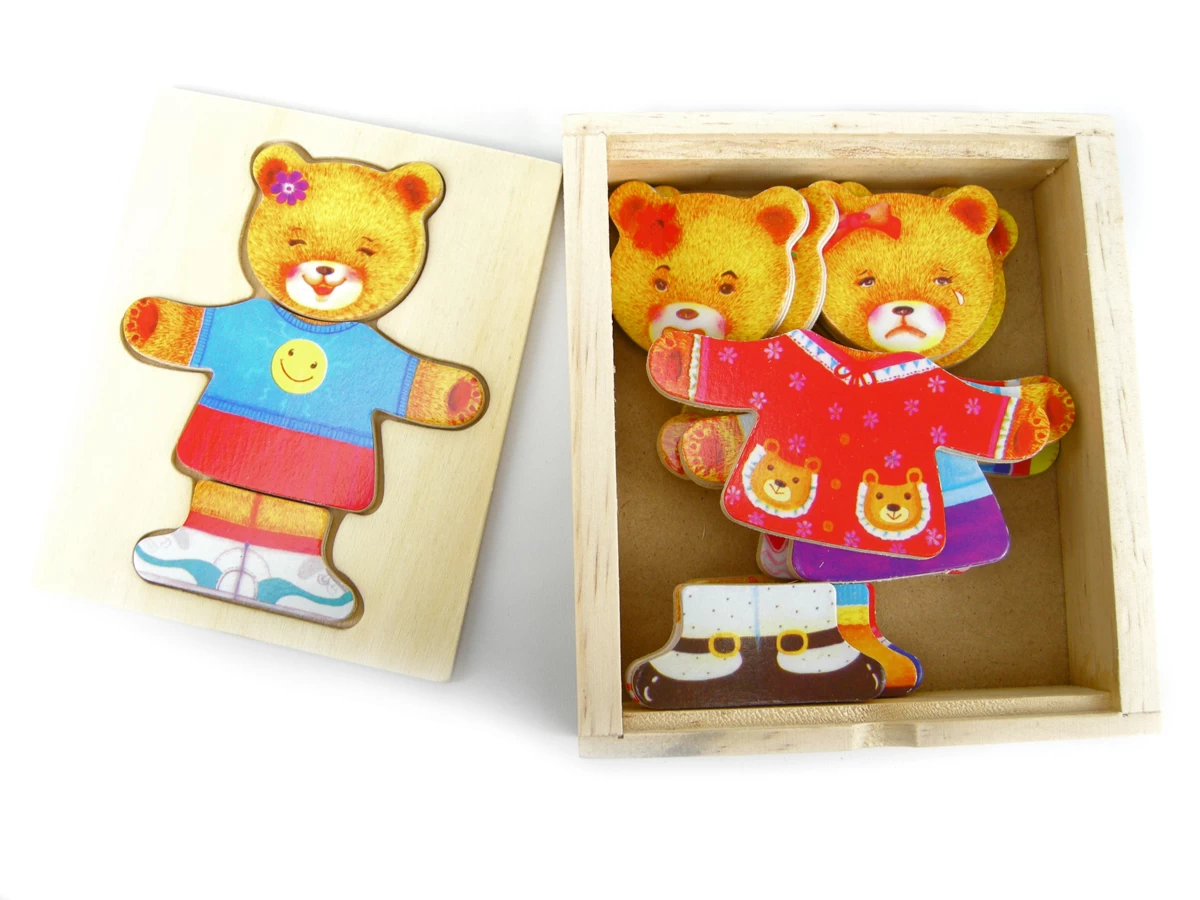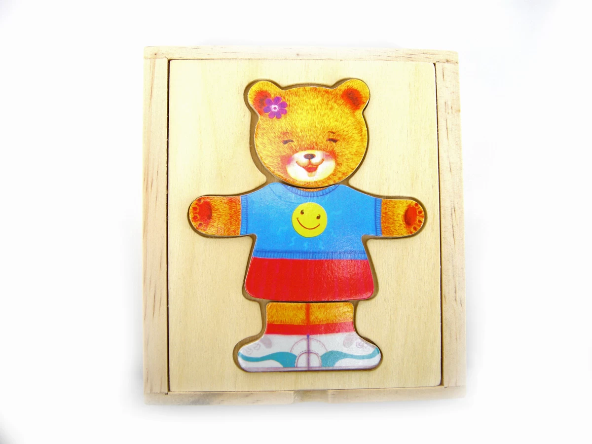 This classic wooden dressing bear girl puzzle is a lovely mix and match set aimed for ages 3+. Complete with 6 unique emotional expressions, tops, and pants. This creative set of 18 pieces can create up to 216 different combinations. The six facial expression is a great way to talk about feelings with your little one.