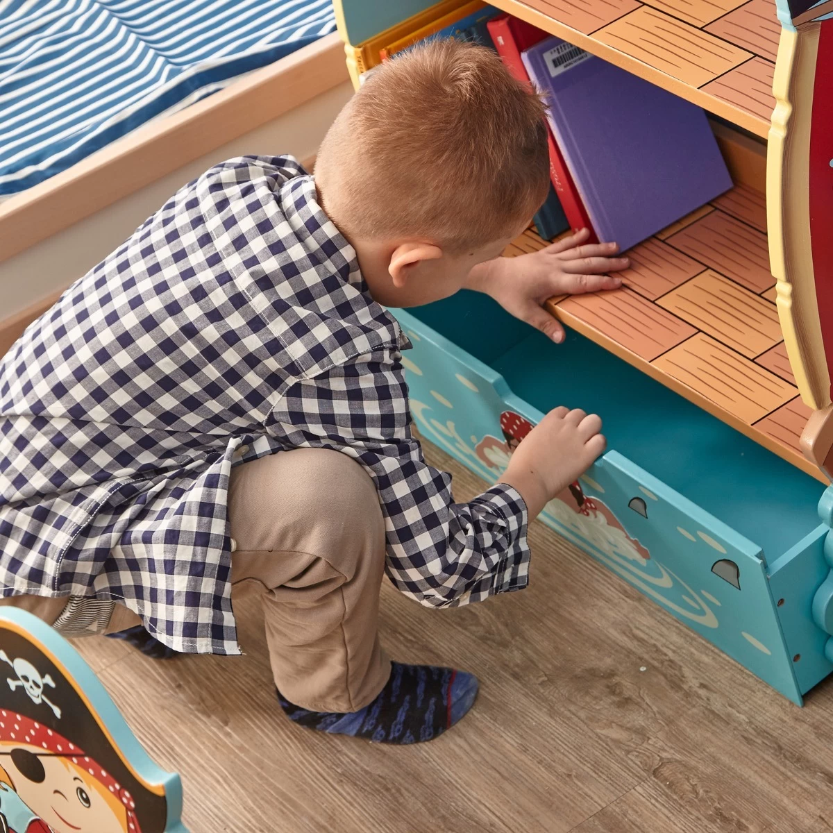 Ahoy you’ve found it! The best place to store your favorite reads. This hand painted and hand carved Pirate Bookshelf is the ultimate place to store your books as well as other items. Three levels of space offer a chance to stack up some of your belongings, and the drawer below is a great spot to hide away some mementos.Â