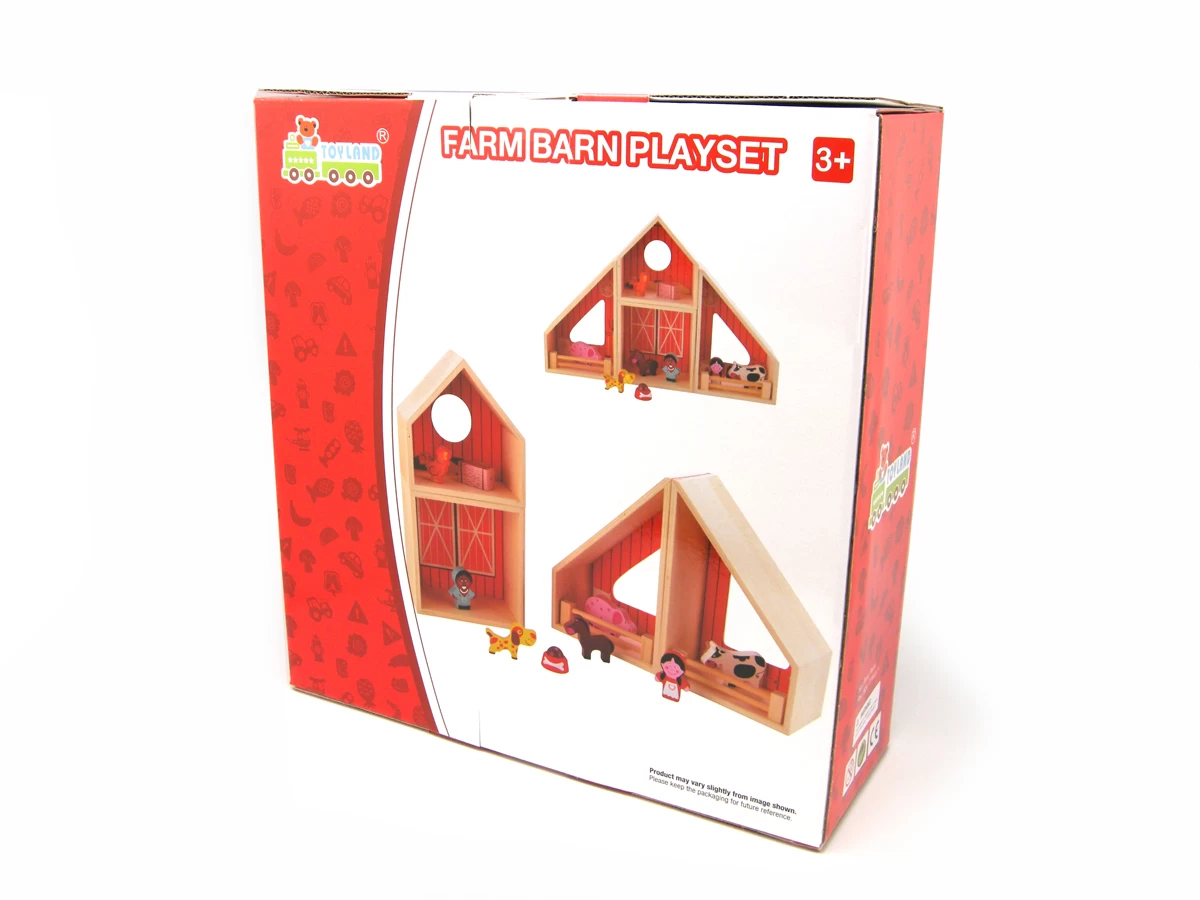 Wooden Farm Barn Play Set. This cute farm barn play set comes in 4 separate pieces. Easy to assemble. A well design product, non toxic paint used. Come complete with wooden farm animals. Play sets encourages role play which help with improving social skills, creativity, problem solving and most importantly fine motor skills. children will have hours of fun with this set.