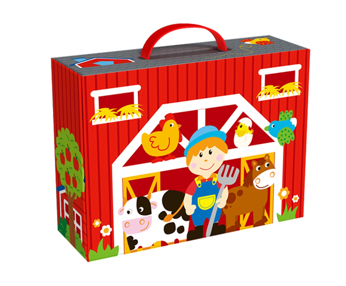 This is a well-made farm travel box play set. Kids will be able to enjoy this set on the go. The front panel folds down and reveals the interactive play area. This box comes complete with farm animals, a tractors and accessory to compliment the scene. When finish playing the box folds up and everything can be stored inside and comes with a helpful handle on the top of the box. Pretend play enhances creativity and problem-solving skills.