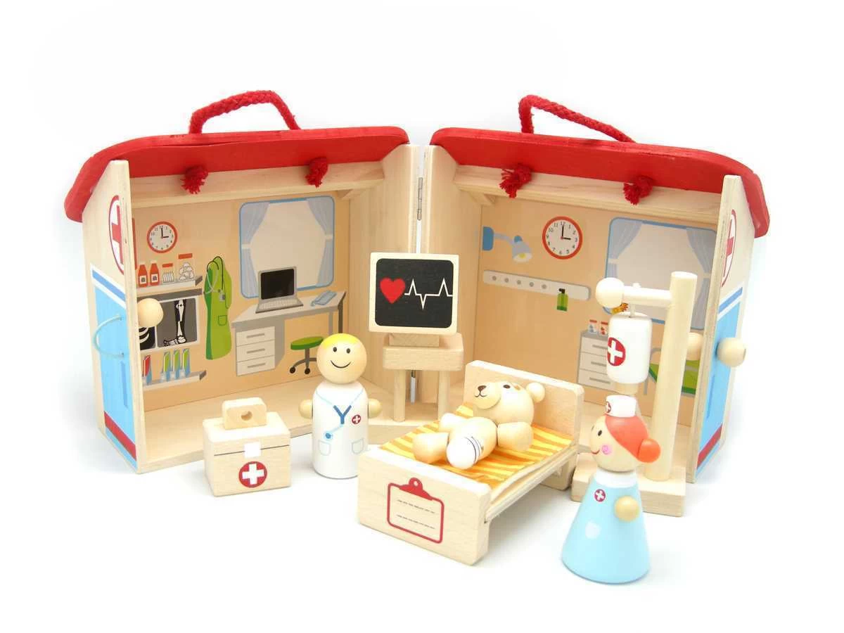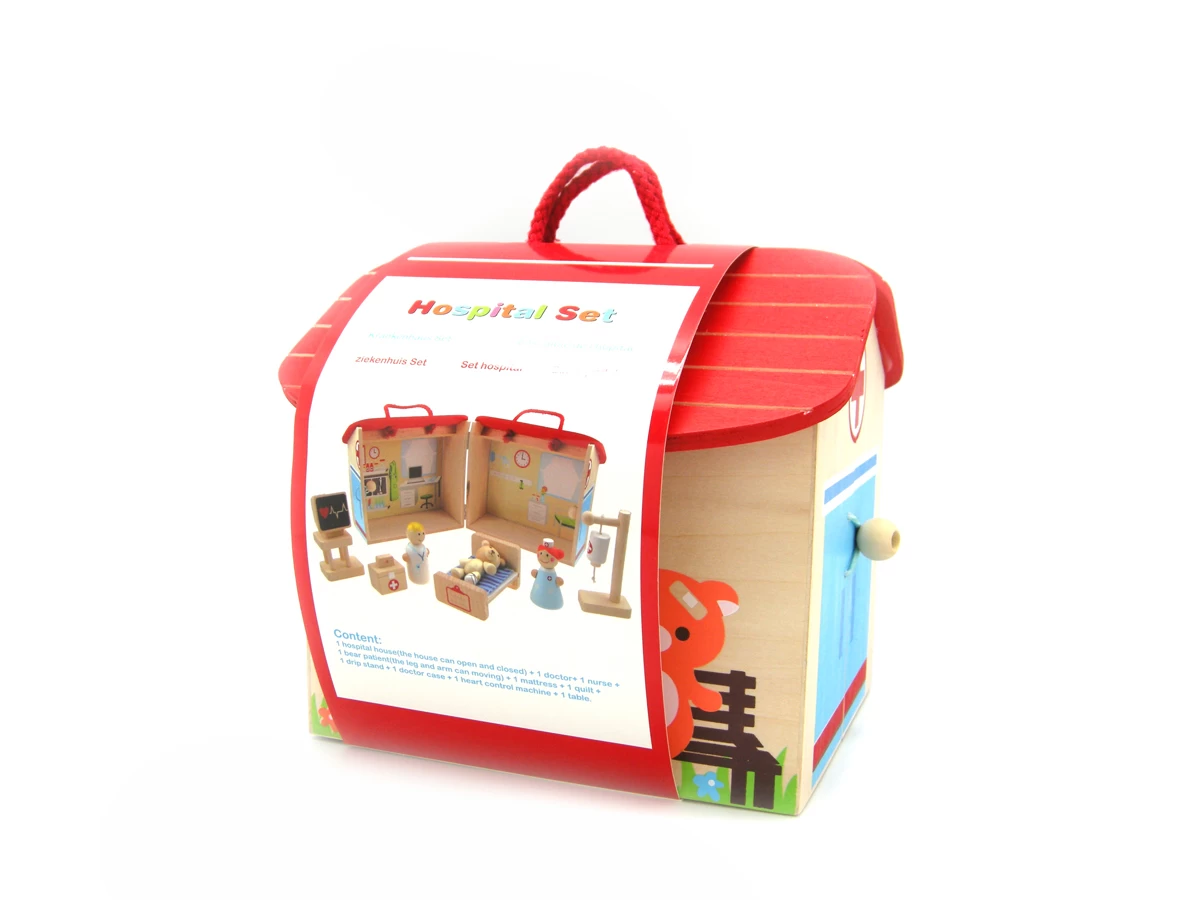 Role play encourages social interaction. This is what this play set promotes. It has everything you need to set up a hospital room. When finished playing, all small parts can be packed into the house. Made with good quality wood. Nontoxic painted used.