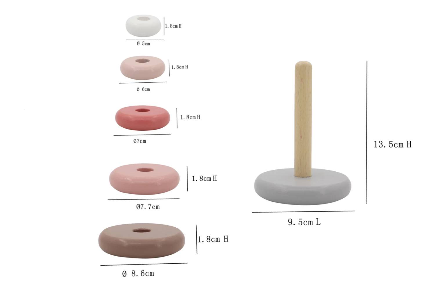 Traditional stacking tower with a modern colorful twist! This wooden stacker comes a solid base with five round stacking discs a child can thread onto the central post. Children can explore mixing up the rings, learning about sizes, color combinations and design. Develops motor skills and hand-eye coordination. Made from high quality wood and non-toxic paint.
