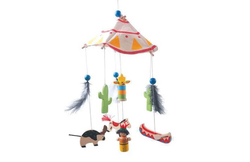 Indian Mobile. This simple mobile will add character to any room. The mixed colours will compliment any decor. Each mobile is individually packed in a bright yellow box. 3 years plus. Size – 4 x 28 x 30 centimetres.