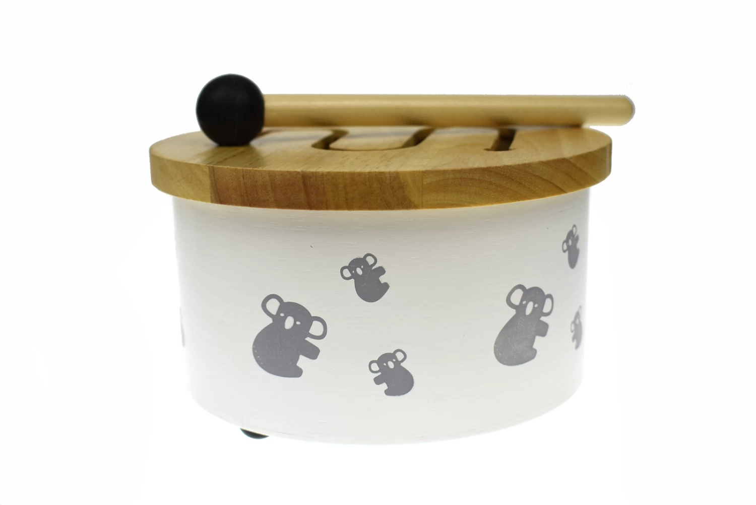 This gorgeous wooden drum is made from natural wood and covered with drawings of our cute koalas. Beautifully boxed and comes with 1 rubber ended drumstick. Drumming is a fantastic example of a skill that teaches discipline. Kids will have hours of fun play alone or with friends.Â