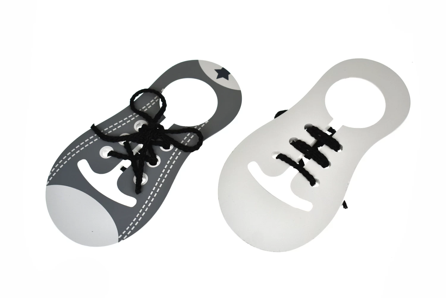 What a wonderful way to teach kids how to tie shoelaces! it’s a bit tricky at the beginning but they will soon get it. Promotes hand eye coordination, fine motor skills and the practicalities of learning to tie shoelaces. Made with good quality plywood. Paint used are nontoxic and painted with a lovely wolf grey colour. Comes in a pair of left foot and right foot.