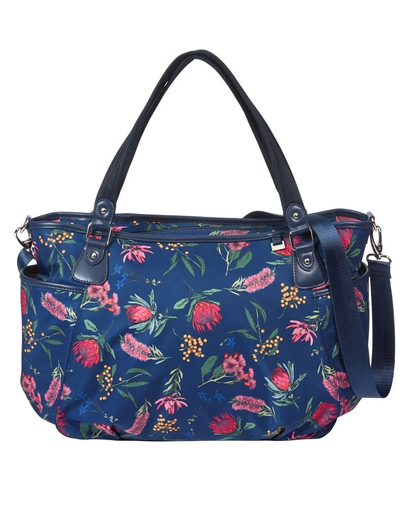 Botanical tote Navy ground includes Bottleholder, change mat, wet purse, stroller straps, long web shoulder strap. Water-resistant finish.