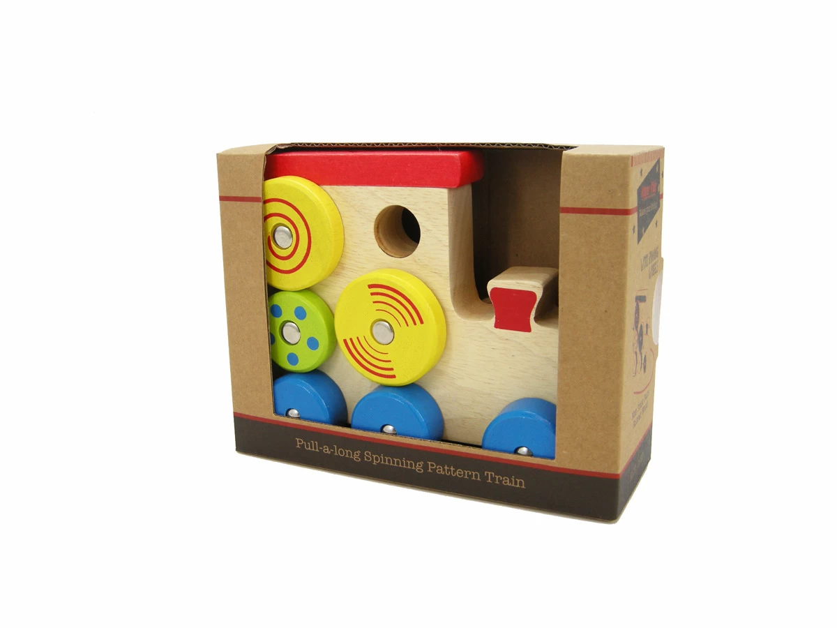 Wooden Pull a Long Spin Pattern Train. A well made wooden pull a long train with colourful spinning patterns. It is made from good quality rubber wood and painted with non toxic paint.