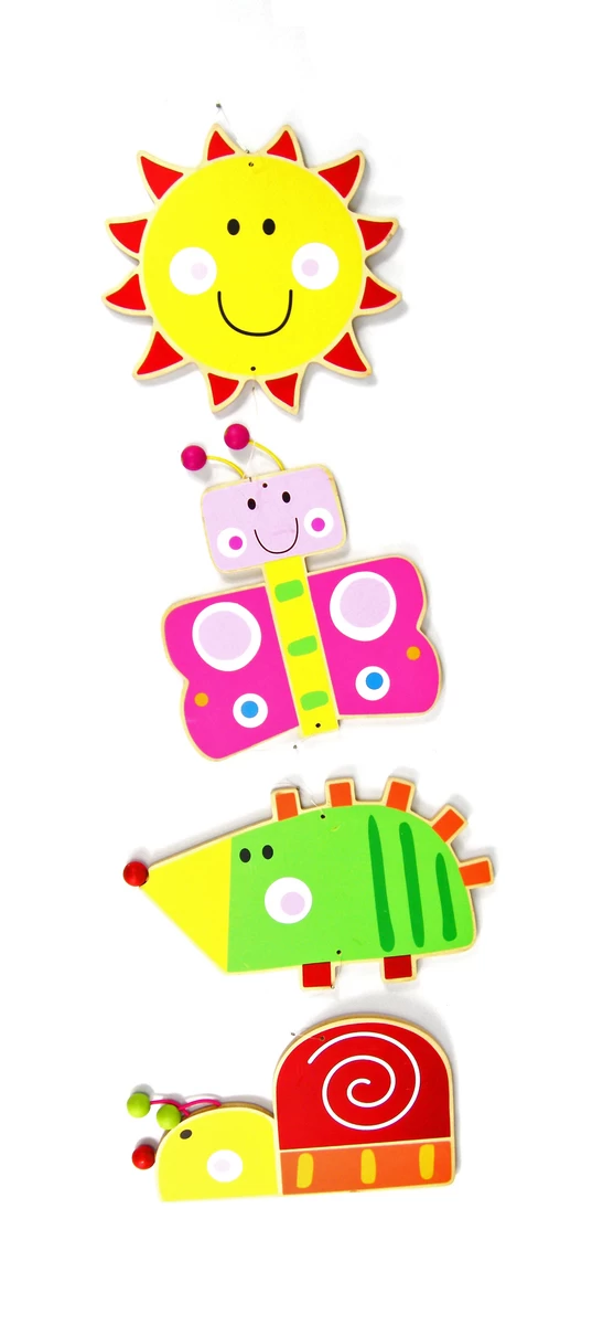 This a bright and vibrant wooden mobile. Made with wood quality wood and painted with non toxic paint.This lovely piece will brighten up any kids room. Can be easily hang from the ceiling. It has been suggested that colors can influence the behavior of a young child.