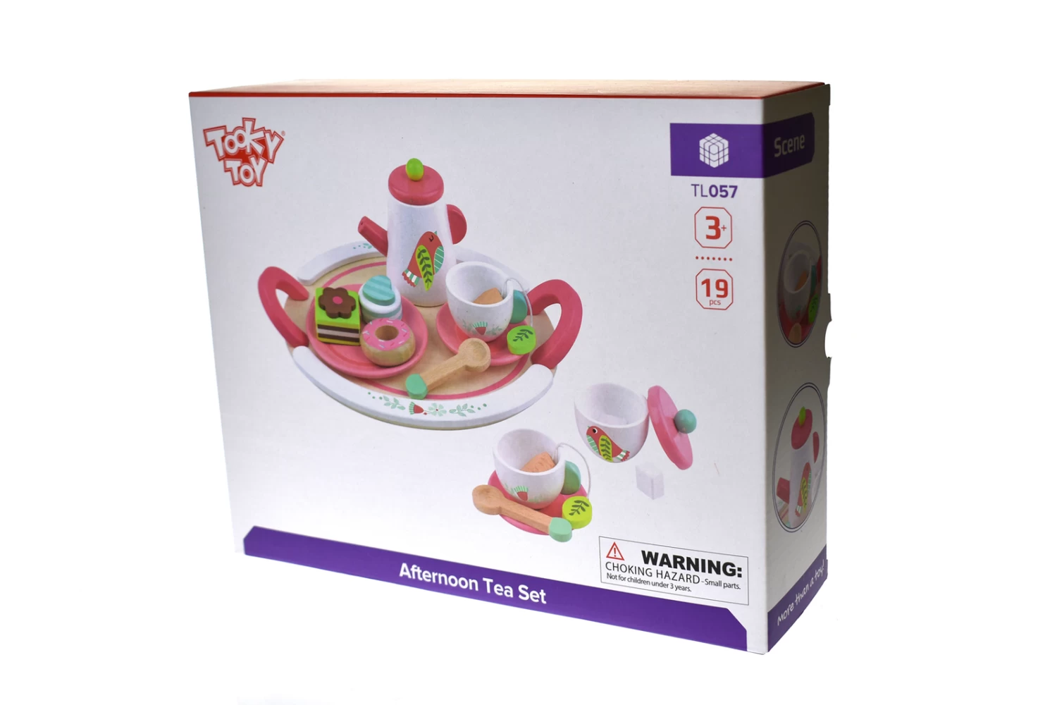 This sweet wooden tea set with a beautiful bird design is so much fun to play with as you pretend to serve your friends, family, pets or toys delicious cups of tea with even yummier cake. Your child will enjoy playing over and over again with this delightful tea set. With plenty of accessories, stories and roleplaying will go on and on forever. Each wooden tea set includes a wooden tray, a teapot, sugar pot, 2 tea cups, 2 saucers, 2 tea bags, 2 spoons, a large plate and 3 assorted cake desserts. Each wooden afternoon tea set from Tooky Toys is made from timber, finished to the highest quality and painted in child safe, non toxic paint.