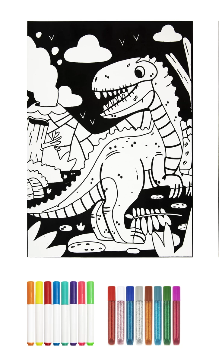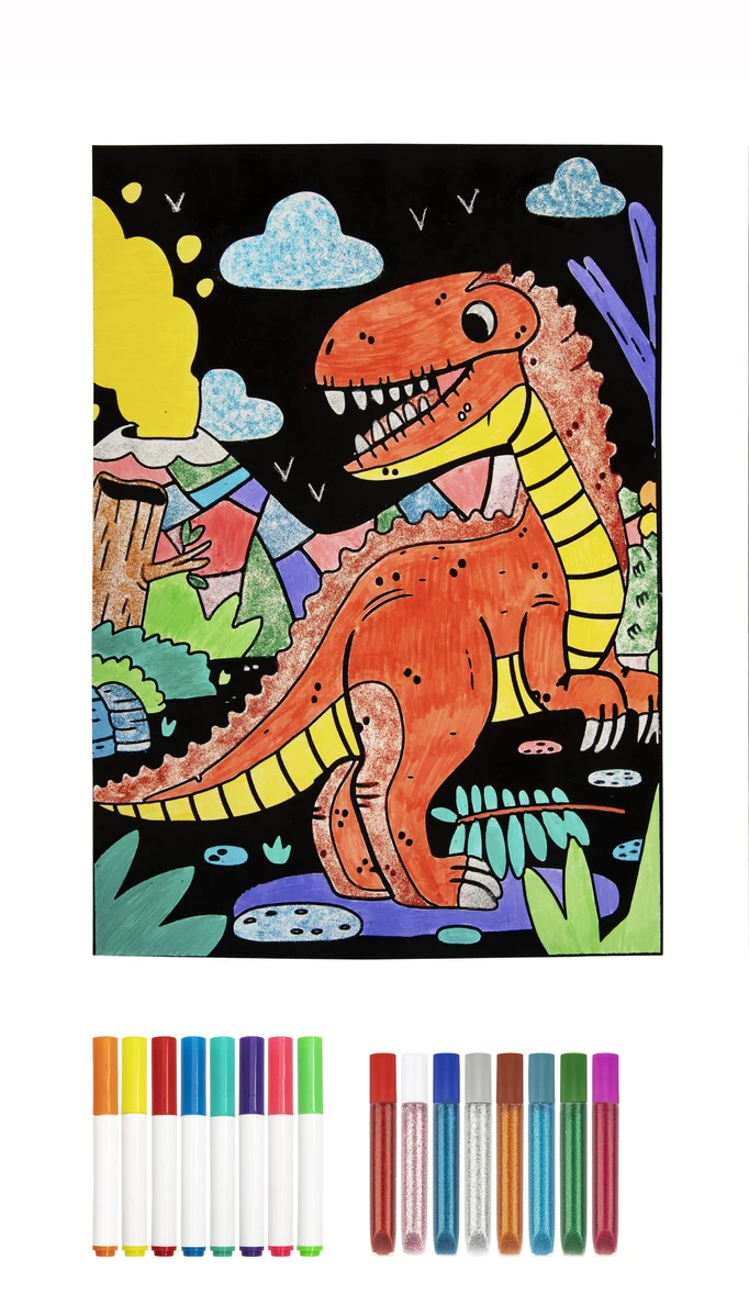 Children can create an amazing artwork for their bedroom. Large flocked board with Dinosaur image. Use the 8 colored markers and 8 glitter glue pens to color in and complete their masterpiece.